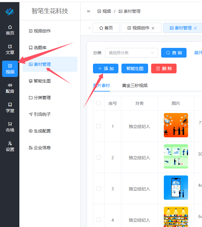 统一在素材管理中添加。如果企业不想自己上传,也可以让AI智能生成——只要企业填写好信息,AI会分析企业的产品、业务、客群,帮企业生成适合的图片素材。